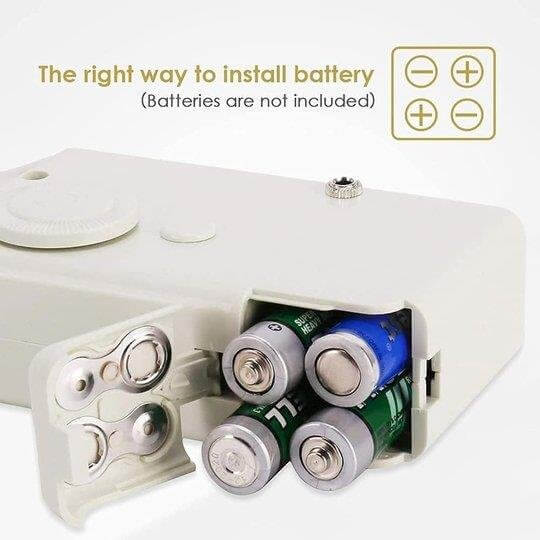 The first step in using this stitching device is to load the four AA batteries. The batteries go in the compartment on the bottom. After loading the batteries, the sewer should set up the bobbin and thread the machine.